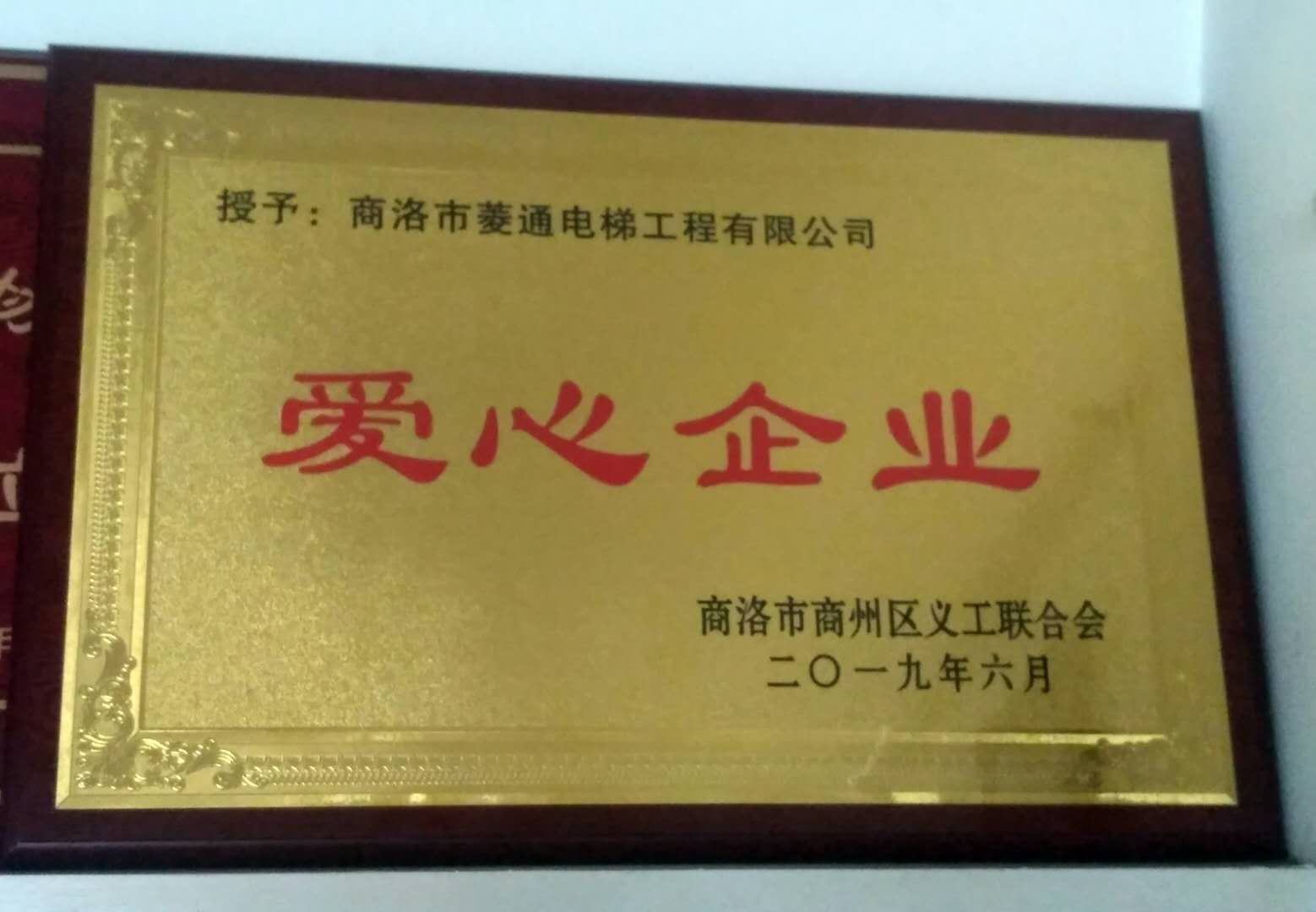 商洛市商州區義工聯合會授予:商洛市菱通電梯工程有限公司愛心企業獎牌一個
